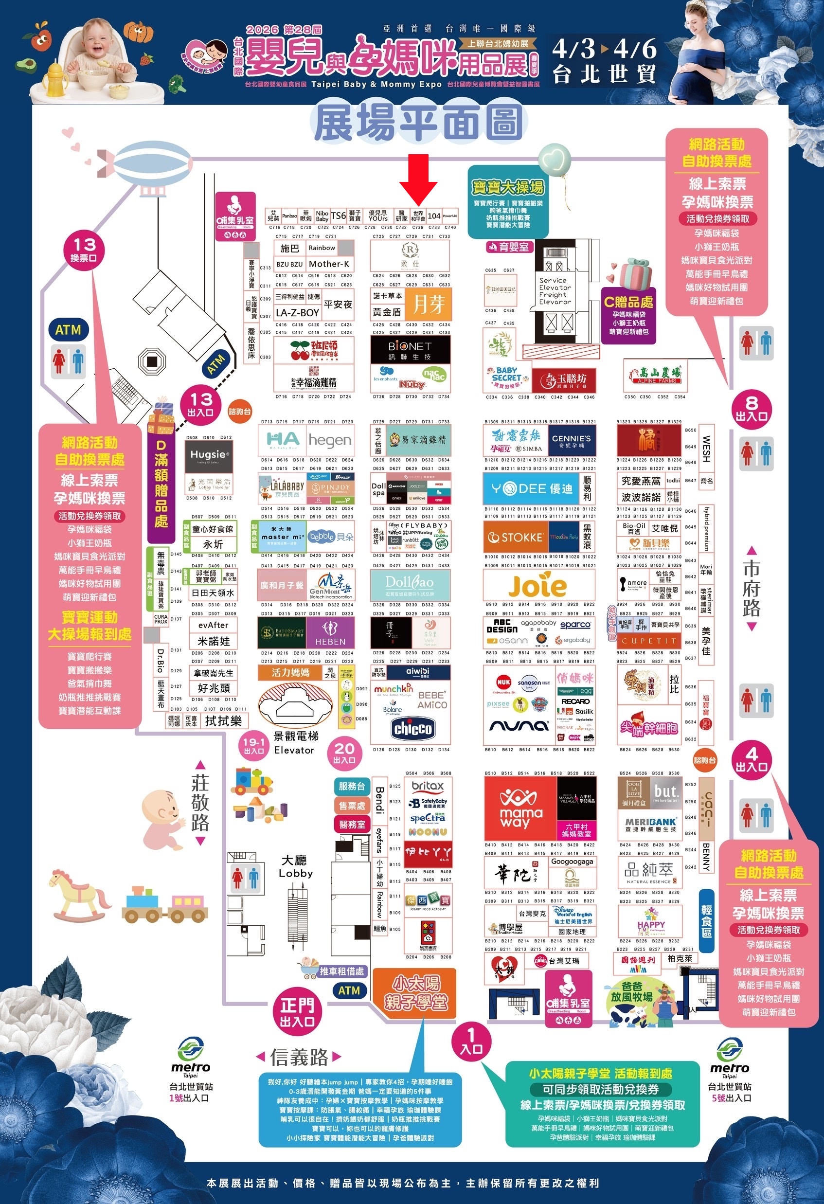 (位於展場平面圖最上方紅箭頭處,鄰近左上角13出入口與上方育嬰室)