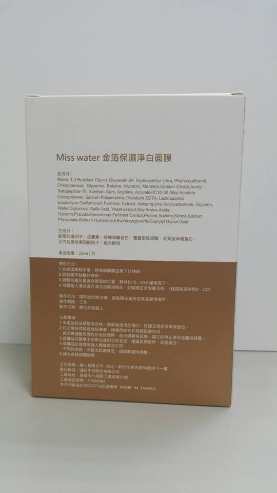 凡於活動期間:106年3月5日(日)~4月5日(三),購買「Miss water金箔保濕淨白面膜」(每盒5片裝,售價245元),Miss water即捐贈20%給世界和平會,幫助家境貧弱孩童的學習費用,讓他們安心上學。
