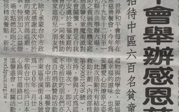 【少年中國晨報電子報報導】搶救危機兒 世界和平會辦慈善餐會搶救危機兒 世界和平會辦慈善餐會 少年中國晨報電子報/99.12.18/陳儀鐸、鐘登國/台中 世界和平會每年在歲末迎新之際,皆會舉辦感恩慈善餐會,今年為第6年於中部地區辦理,自99年12月至100年元月底於台中縣市、彰化縣市共舉辦6場。活動中邀請本會中部地區受助之貧弱與危機家庭學童免費用餐同樂,希望透過溫馨兒童魔術派對餐會的方式,讓孩子們感受社會關懷,肯定自我,鼓舞向上,同時鼓勵社會中安處於幸福家庭的善心人,本著關懷與回饋社會的心,一同來扶助正處於發展階段的貧弱與危機家庭的兒少朋友們,給予他們持續前進的力量。今年本活動台中市第一場,除了承蒙台中市政府與社會各界鼎力協助以外,尤其感謝此次位於台中市東區三級古蹟香火鼎盛的樂成宮媽祖廟,一本宗教慈憫觀照眾生的初衷,特別加入公益燎原的傳遞薪火,從台中市第一場次點燃起跑之火,大力支持本次餐會活動,提供精美餐點。新年禮物與助學金,要協助更多貧弱的孩子,品嚐溫暖幸福的滋味,也希望藉此喚起更多星星之火,要讓愛心如燎原之姿,盡力擴散,無遠弗屆。本次活動所有結餘將全數捐助「搶救危機兒」救助計劃(內政部核准公益勸募字號:內授中社字第0990015876號),同時歡迎社會大眾共同參與支持,參與方式為認購愛心餐券每張500元(台中市場次),即可入場與孩子們一起用餐同樂,不克前往的朋友們亦可認捐愛心餐券予貧童用餐或自由捐款贊助本活動。台中市第一場餐會時間為99年12月17日(週五)晚間6點至8點半假台中市樂成宮(台中市東區旱溪街48號),台中市第二場餐會時間為100年1月21日(週五)晚間6點至8點半假台中市松戶日本料理國際宴會館(台中市文心路與甘肅路口),誠摯邀請大家一同參與這場溫馨盛會。相關活動訊息請查詢網站:http://www.worldpeace.org.tw