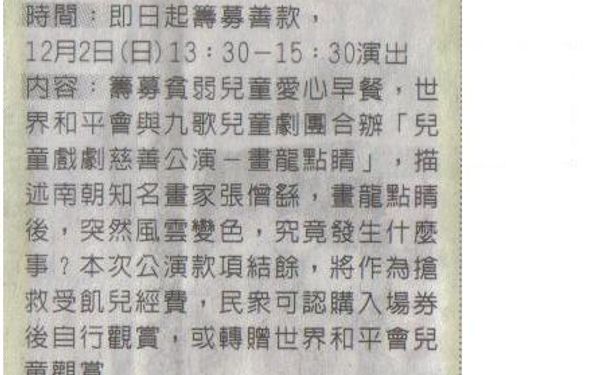 101.10.30~11.05/巨報/嘉義報導時間:即日起籌募善款,12月2日(日)13:30-15:30演出內容:籌募貧弱兒童愛心早餐,世界和平會與九歌兒童劇團合辦「兒童戲劇慈善公演-畫龍點睛」,描述南朝知名畫家張僧繇,畫龍點睛後,突然風雲變色,究竟發生了什麼事?本次公演款項結餘,將作為搶救受飢兒經費,民眾可認購入場券後自行觀賞,或轉贈世界和平會兒童觀賞地點:捐款洽世界和平會嘉義市會館(蘭井街216號),活動於嘉義縣表演藝術中心演藝廳演出電話:05-2255164備註:捐款金額300、500、1000元,每筆款項皆開正式捐款收據,可抵所得稅