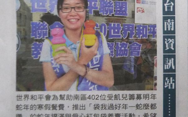 義賣年撲滿 籌受飢兒餐費2012.12.05/自由時報/記者王俊忠/台南報導 世界和平會為幫助南區402位受飢兒籌募明年蛇年的寒假餐費,推出「袋我過好年-蛇麼都讚」的蛇年撲滿與愛心紅包袋義賣活動,希望社會善心人士認購,讓貧童在寒假可吃飽、過好年,認購專線2150575。