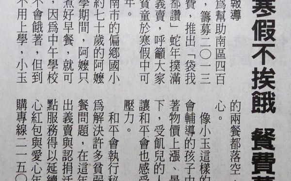 【中華日報】讓貧童寒假不挨餓餐費募集中