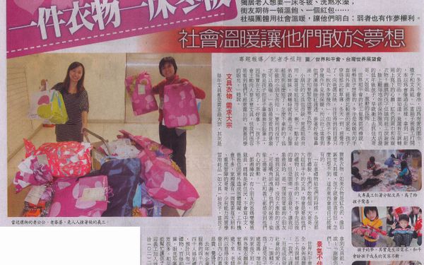 一件衣物一床冬被 社會溫暖讓他們敢於夢想「冬天不會冷,因為有愛的圍巾、襪子和文具組。」當箱子被義工打開,本以為會像過去那樣,拿到一組新的文具用品,誰知道,竟還有在課輔班上寫下的心願:紅色的圍巾和保暖衣物!靦腆的孩子低頭向社工說謝謝,臉上難得地始終保持微笑,而活潑的低年級孩子,早就衝上去抓住大哥哥、大姐姐,激動的抱抱。世界和平會的社工督導鄧湘樺說,弱勢孩子想要的,多半是保暖用的手套與外套,經濟比較差的家庭,孩子穿得都比較單薄,冬天一到,感覺冷了,向爸媽反映,往往得到的回應只是「秋衣多穿幾件」,但孩子不懂多穿幾件不見得保暖,所以社工常看到他們凍得滿臉紅通通、掛著好幾條鼻涕,才知要緊急送禦寒衣物去。小朋友的文具也很缺,常是姐弟共用,當哥哥姐姐用完,剩下一點才給弟弟妹妹,課輔時就有義工問,鉛筆都用到這麼短了,怎麼不拿新的?低年級的小朋友告知:「要用到沒有了才可以換喔。」老師最常看到的景象,就是孩子把原子筆蓋套在鉛筆上,因為實在太短了,不好拿,「孩子不會主動向人要求要文具,但我們很容易看到他們不經意露出的、羨慕同學的眼光。」她說。文具衣物 需求大宗每年文具都是需求最大宗,其次是禦寒衣物,如果衣物是紅色的,像耶誕老人那樣,孩子就會欣喜若狂,怎麼也想不到,這些東西會是自己能擁有的。「在拿禮物給他們的時候,各個都很有禮貌,他們不敢相信,大哥哥、大姐姐手中的文具,待會是要給他們的禮物;孩子乖乖的,不會爭先恐後的搶,但是眼睛一直在發光!讓我印象最深的,是一個個性害羞的小朋友,看到文具組時,沒有太激動的反應,可是嘴角卻洩漏了他們的祕密:偷偷上揚著,社工和義工都感受到他們內心的激動。」鄧湘樺說,有小朋友的爸媽雙雙被裁員,媽媽是新住民,不會寫中文,爸爸也因意外造成肢體障礙,工作機會不多,家裡還有一個需要每天照料、重度智障的哥哥,少有能力再買學習消耗品(如文具)給孩子,當孩子拿到文具組,媽媽很為他們開心,直說:「謝謝你們的關心,你們好愛我們!」景氣不佳 禮物短缺世界和平會服務於基隆的專員鄒博全,參與過贈送禮物給兩個學校、共五十名課輔班孩子的活動三年,他說:「我們上課時從不說:你們是弱勢,而是成長背景與人不同,因此拿到社會給的愛心禮物後,學習要加倍努力。」課輔不只是作業和學科輔導,為了避免孩子放學回家無人照料,四處遊蕩,增加危險性,課輔時間延長到家長下班,這期間,還會帶他們參與各種志願服務,如做社區清潔和教室整理,或在園遊會上表演;長期相處下來,老師都知道孩子想要什麼,所以看得出來小朋友拿到禮物時,是發自內心的真實快樂,不是那種禮物昂貴、覺得可以炫耀的快樂。去年有企業認捐,讓世界和平會服務的四千六百個貧弱孩子中,有四千人得到禮物,今年景氣不佳,預計只有一千五百個孩子可拿禮物,而每組文具需要三百元預算,眼見耶誕節將至,離目標還差很多,和平會希望社會或企業能幫忙讓孩子的笑再被看見,也歡迎義工加入送禮物的行列,詳情可洽(○二)二五五二八八二八。(李祖翔報導)