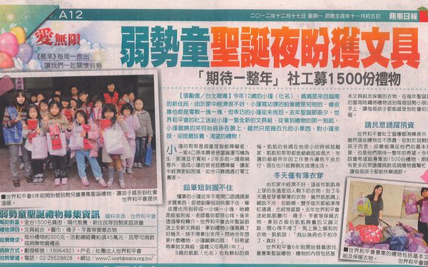 【蘋果日報】弱勢童聖誕業盼獲文具
