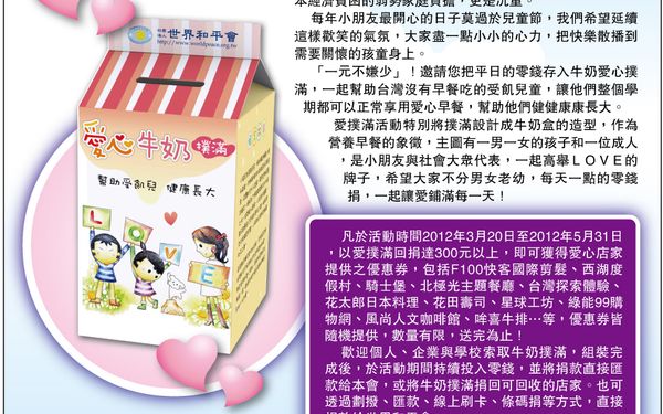 為貧弱孩童募愛心早餐費用,世界和平會出奇招,五月起與民宿業者合作,推出「南台灣公益民宿大會串」活動,在每個住宿的房間內都會放置一個愛心款信封,邀請所有入住的旅人,用口袋中的零錢來做公益。參與這項公益活動的民宿業者,包括台南歐味思山莊、佳佳西市場旅店、佳佳小南天旅店與宏盛鑫商務飯店等;佳佳西市場旅店業務行銷人員說,旅社可以參與幫助孩子的行列,是件很棒的事情,現在每天整理房間,補充愛心捐款信封時,總會順道祈禱下一位入住的旅客,也可以共同幫助孩子。和平會表示,在油電雙漲的壓力下,要救助的孩子有增無減,此次活動就是透過民宿的精心布置,讓民眾在分享旅遊心情的同時,也能藉由愛心信封的引導,讓旅遊的意義除了得到身體的放鬆,還帶著滿滿的愛回憶,希望善心民眾,透過愛心商家店投所放置的愛心零錢罐或是索取愛心信封等方式,幫助孩子一天四十元的早餐,加入「搶救受飢兒」的行列,愛心專線二一五O五七五。(記者黃微芬報導)