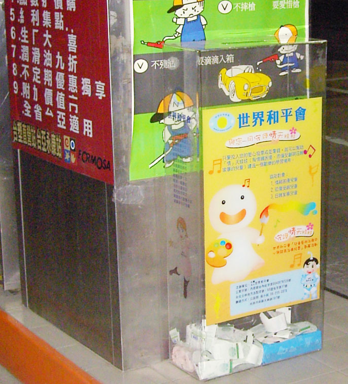 台亞加油站為協助社團法人世界和平會「守護情天娃娃」專案,籌募全省7縣市兒童藝術治療中心,於台南縣市18個站放置愛心發票箱,請民眾加油後記得索取統一發票,並隨手捐贈您的愛心,一起關懷幫助遭受家庭暴力、目睹暴力與情緒困擾的孩子。世界和平會更長期招募愛心企業團體與商家提供發票箱據點,歡迎公益愛心企業來電索取發票箱。索取專線:06-2150575張小姐。