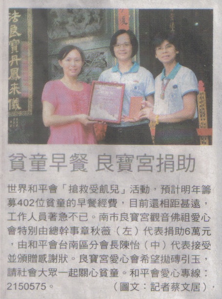 世界和平會「搶救受飢兒」活動,預計明年籌募402為貧童的早餐經費,目前還相距甚遠,工作人員著急不已。南市良寶宮觀音佛祖愛心會特別由總幹事章秋薇(左)代表捐助6萬元,由和平會台南區分會長陳怡(中)代表接受並頒贈感謝狀。良寶宮愛心會希望拋磚引玉,請社會大眾一起關心貧童。和平會愛心專線:2150575。