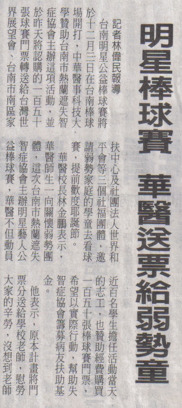【中華日報】明星棒球賽 華醫送票給弱勢童