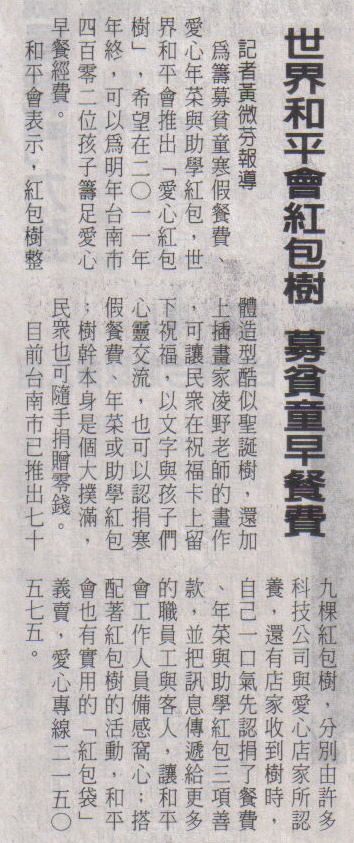 【中華日報】世界和平會紅包樹 募貧童早餐費