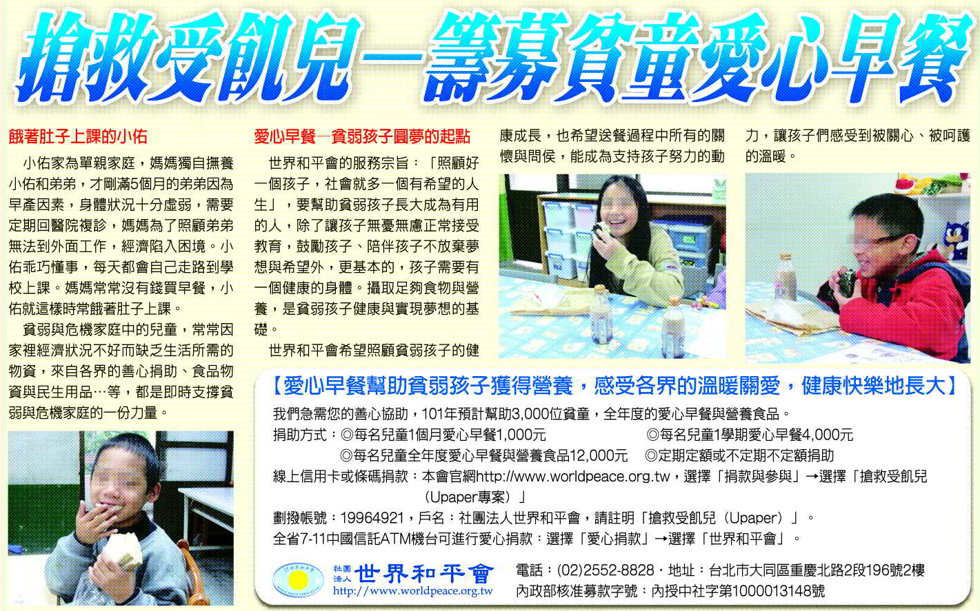 【捷運報Upaper】搶救受飢兒─籌募貧童愛心早餐