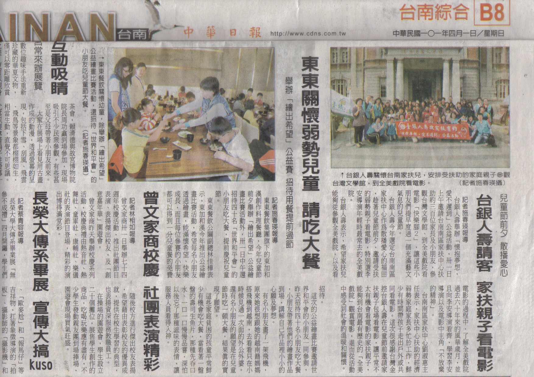 【中華日報】東東關懷弱勢兒童 請吃大餐