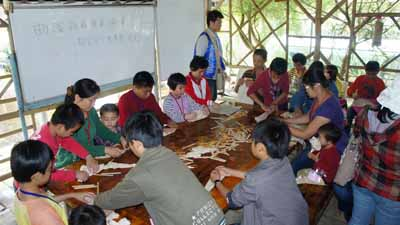 台南市大內區挾酒甕步道,在社區解說員的帶領下,走過烘爐井、生態池,還到無尾山、鏡面山眺望點,欣賞初春的風景,一路上家長與孩子說說笑笑,輕鬆且愉悅的心情和緩了長久緊繃的神經,讓長期與經濟、環境奮戰的家長,得到喘息。再加上「植物染」課程,讓家長能與孩子一起動手去完成紀念品,沾滿植物顏料的雙手,成了孩子與家長最美好的回憶。
