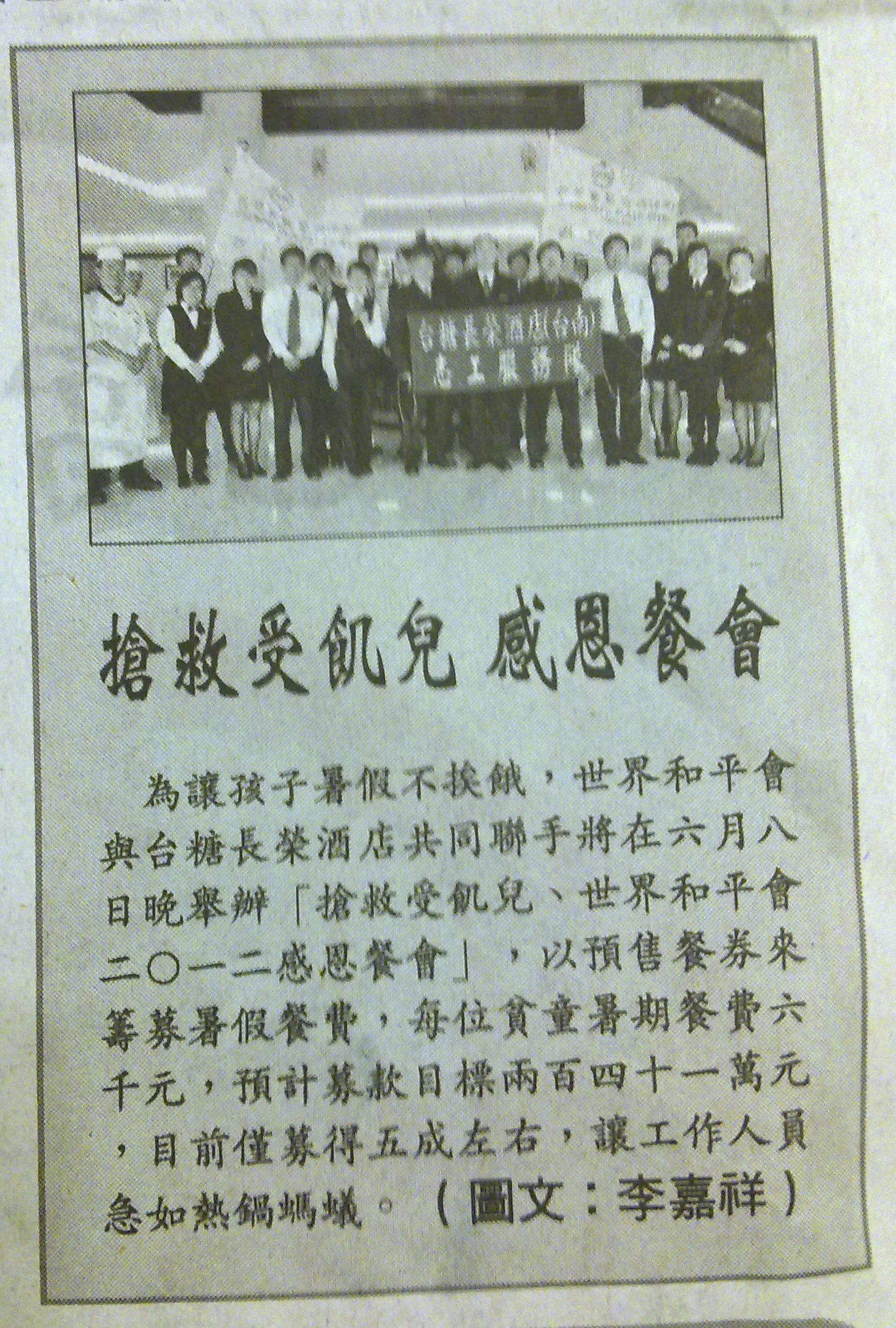為讓孩子暑假不挨餓,世界和平會與台糖長榮酒店共同聯手將在六月八日晚舉辦「搶救受飢兒、世界和平會二○一二感恩餐會」,以預售餐券來籌募暑假餐費,每位貧童暑期餐費六千元,預計募款目標兩百四十一萬元,目前僅募得五成左右,讓工作人員急如熱鍋螞蟻(圖文:李嘉祥)。