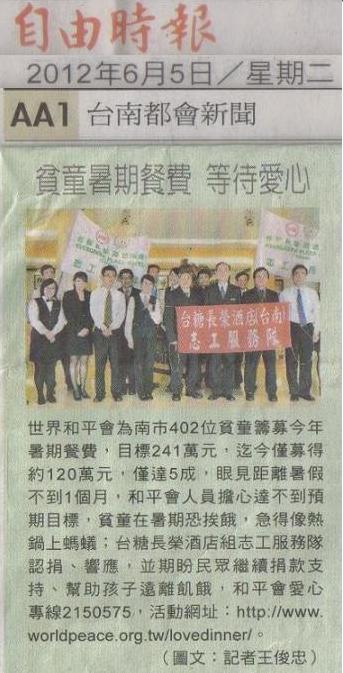 世界和平會為南市402為貧童籌募今年暑期餐費,目標241萬元,迄今僅募得約120萬元,僅達5成,眼見距離暑假不到1個月,和平會人員擔心達不到預期目標,貧童在暑期恐挨餓,急得像熱鍋上螞蟻;台糖長榮酒店組志工服務隊認捐、響應,並期盼民眾繼續捐款支持、幫助孩子遠離飢餓,和平會愛心專線2150575,活動網址:https://www.worldpeace.org.tw/lovedinner/。(圖文:記者王俊忠)