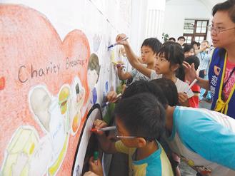 暑假來臨,為了避免家境貧困小朋友三餐不繼,世界和平會、新竹高商等合作發起「愛心撲滿一日捐」,昨天小朋友聚集新竹市政府彩繪夢想公車,希望民眾一起發揮愛心,幫助受飢兒。