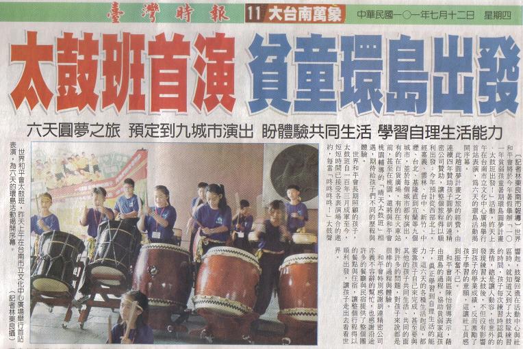 【台灣時報】 太鼓班首演 貧童環島出發