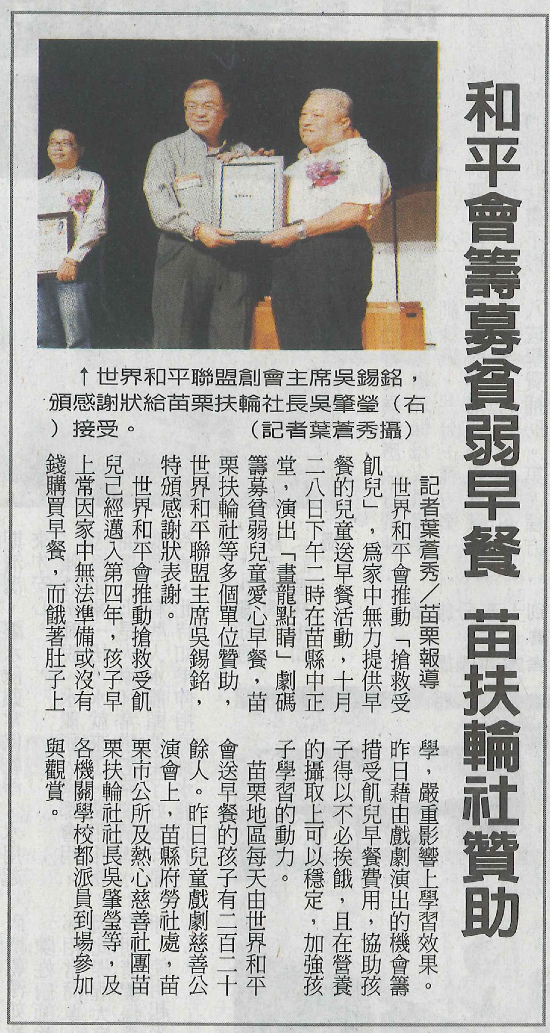 【中華日報】和平會籌募貧弱早餐 苗扶輪社贊助