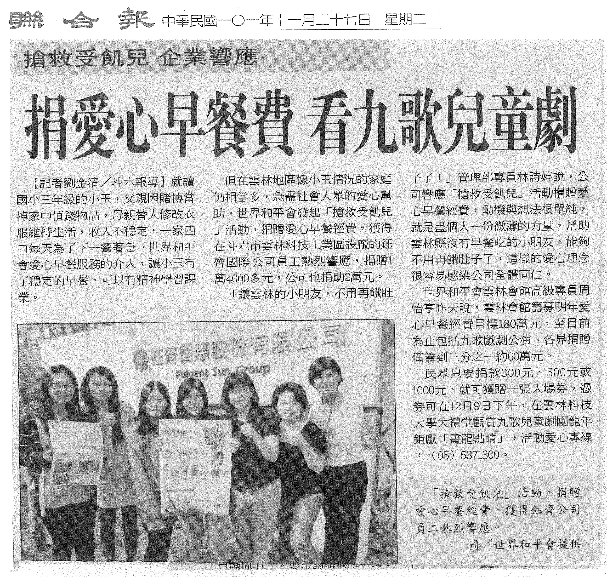 但在雲林地區像小玉情況的家庭仍相當多,急需社會大眾的愛心幫助,世界和平會發起「搶救受飢兒」活動,捐贈愛心早餐經費,獲得在斗六市雲林科技工業區設廠的鈺齊國際公司員工熱烈響應,捐贈1萬4000多元,公司也捐助2萬元。