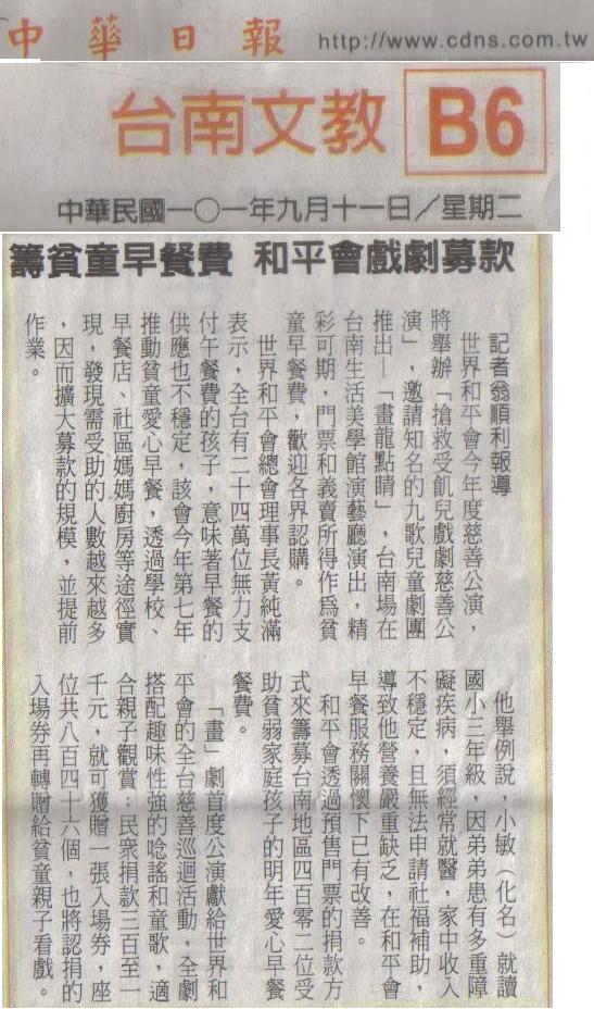 【中華日報】籌貧童早餐費 和平會戲劇募款
