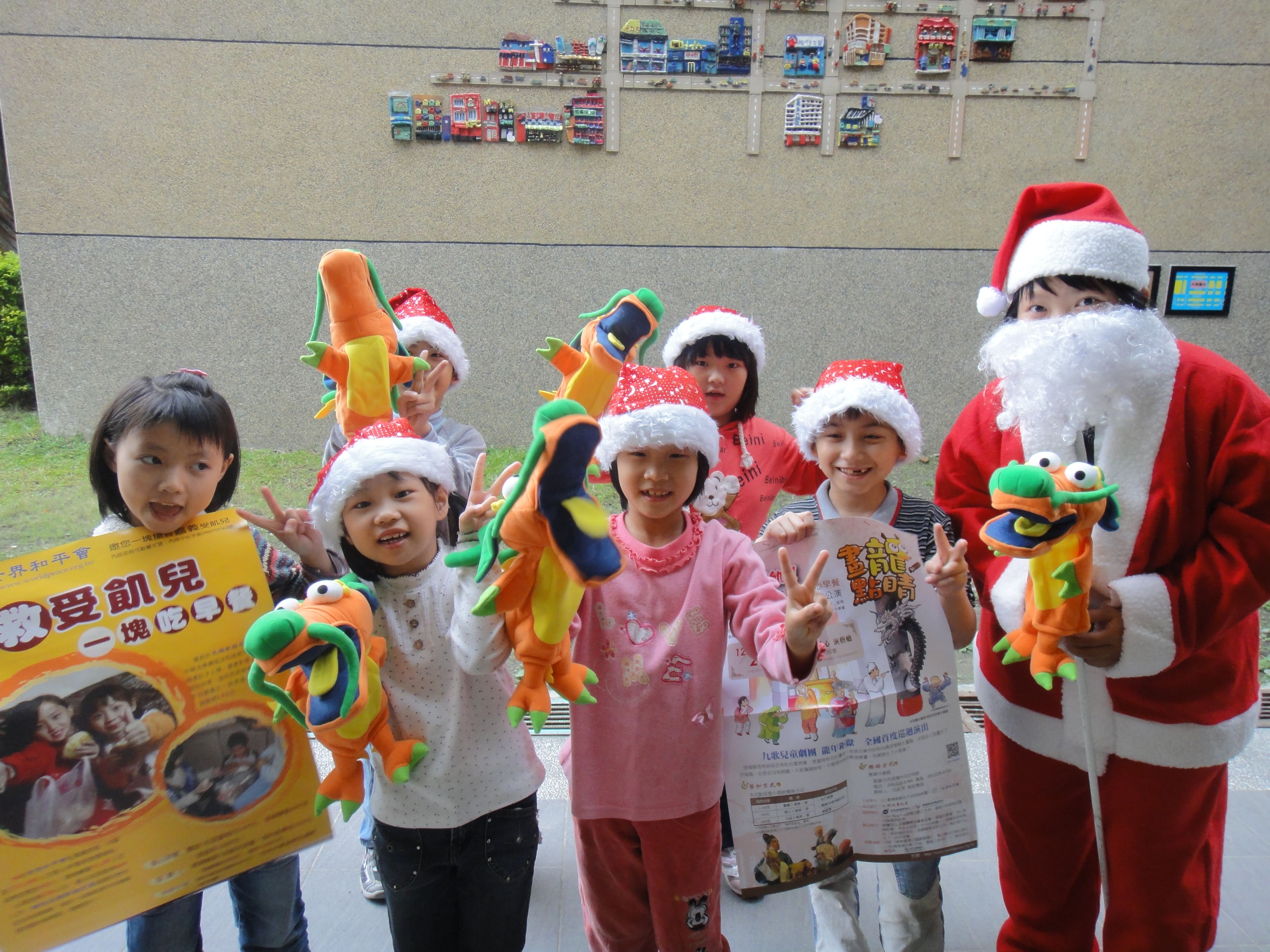 『哇喔!聖誕老公公怎麼會是乘著『龍』來送禮物?!』28日下午,大同國小課輔班內竟有聖誕老公公現身,一邊騎乘著可愛龍頭布偶,一邊發巧克力派,引起小朋友此起彼落的驚呼聲。世界和平會邀您一同投身公益,認捐愛心早餐,讓孩子在聖誕節前夕,能感受來自各界濃濃關懷。捐款1000元可幫助貧童1個月的早餐,響應專線請洽05-2255164。