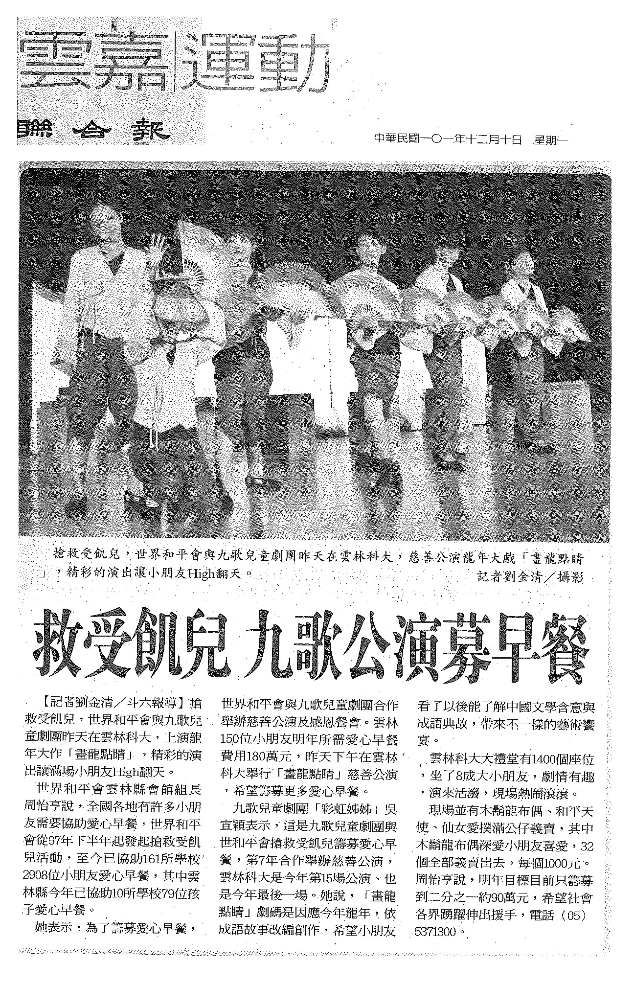 搶救受飢兒,世界和平會與九歌兒童劇團昨天在雲林科大,慈善公演龍年大戲「畫龍點睛」,精彩的演出讓小朋友High翻天。世界和平會雲林縣會館組長周怡亨說,全國各地有許多小朋友需要協助愛心早餐,世界和平會從97年下半年起發起搶救受飢兒活動,至今已協助161所學校2908位小朋友愛心早餐,其中雲林縣今年已協助10所學校79位孩子愛心早餐。