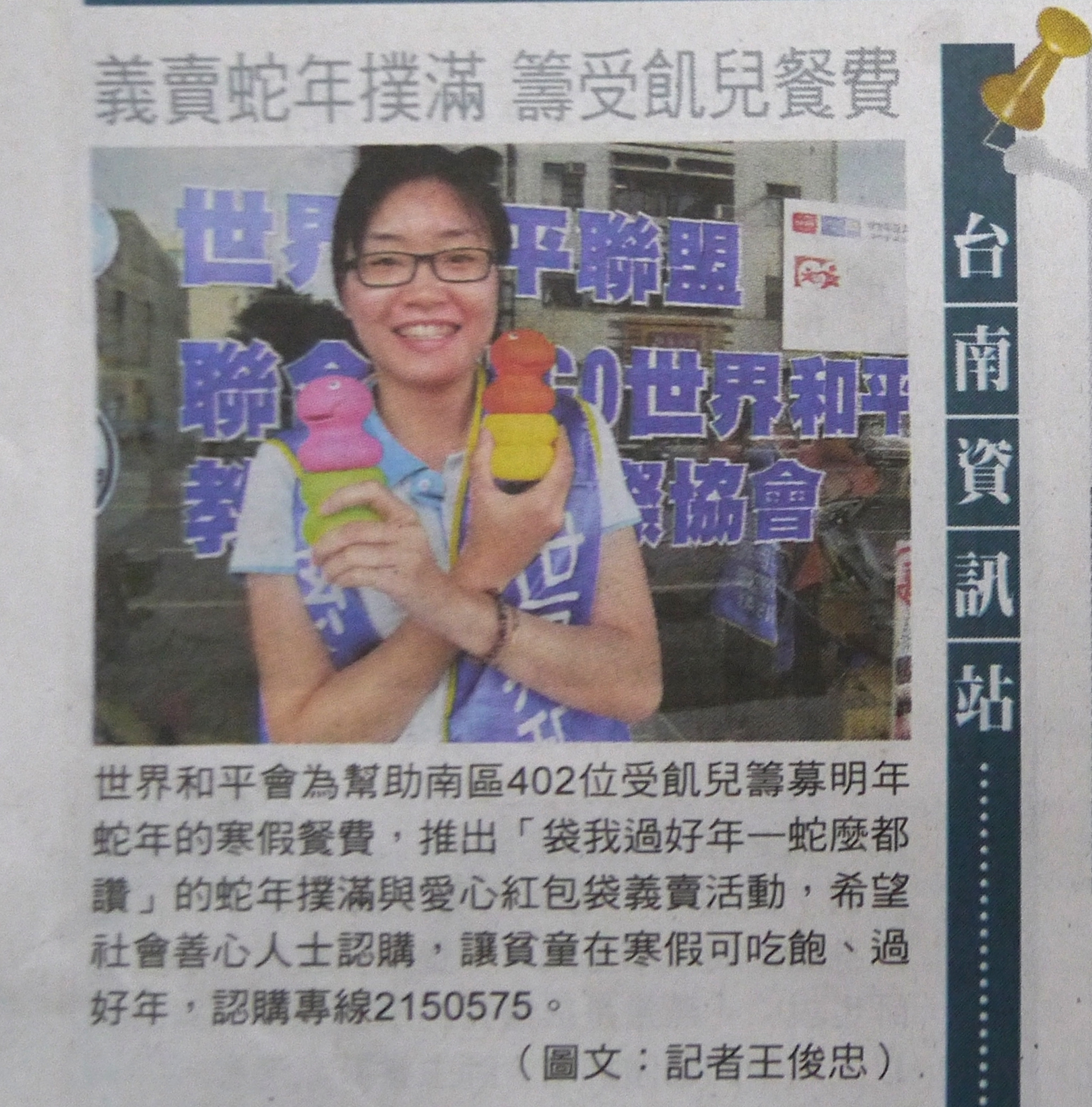 世界和平會為幫助南區402位受飢兒籌募明年蛇年的寒假餐費,推出「袋我過好年-蛇麼都讚」的蛇年撲滿與愛心紅包袋義賣活動,希望社會善心人士認購,讓貧童在寒假可吃飽、過好年,認購專線2150575。
