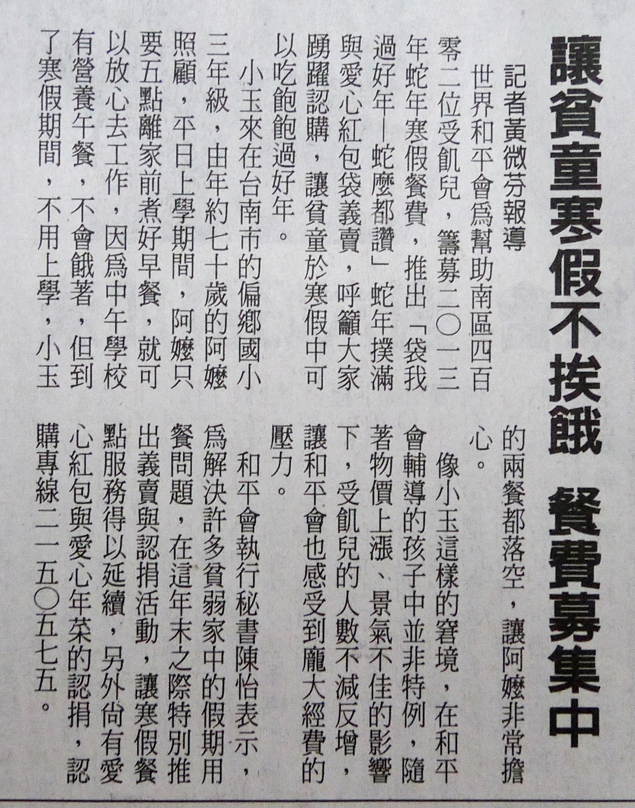 【中華日報】讓貧童寒假不挨餓餐費募集中