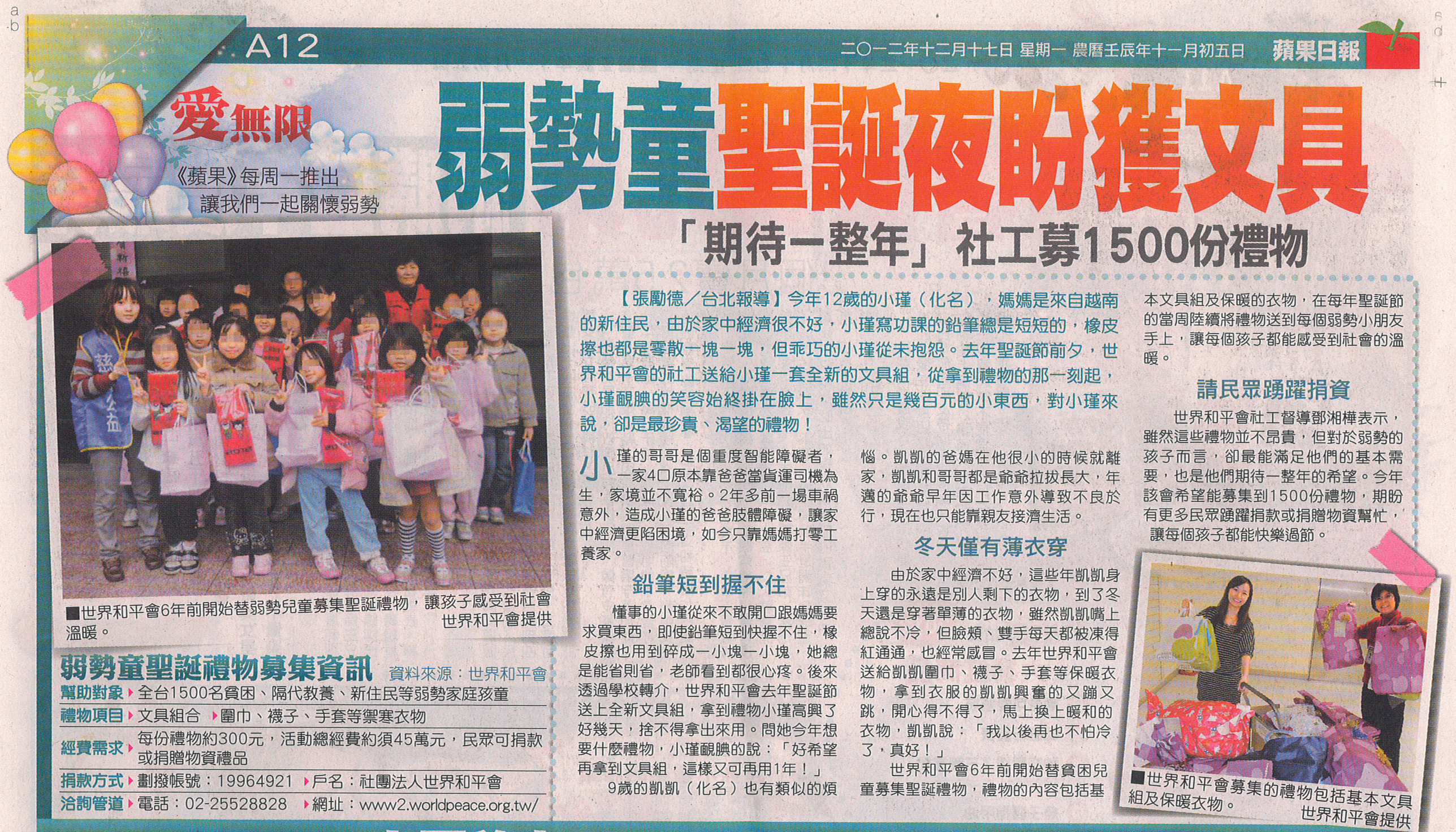 世界和平會6年前開始替貧困兒童募集聖誕禮物,禮物的內容包括基本文具組及保暖的衣物,在每年聖誕節的當周陸續將禮物送到每個弱勢小朋友手上,讓每個孩子都能感受到社會的溫暖。