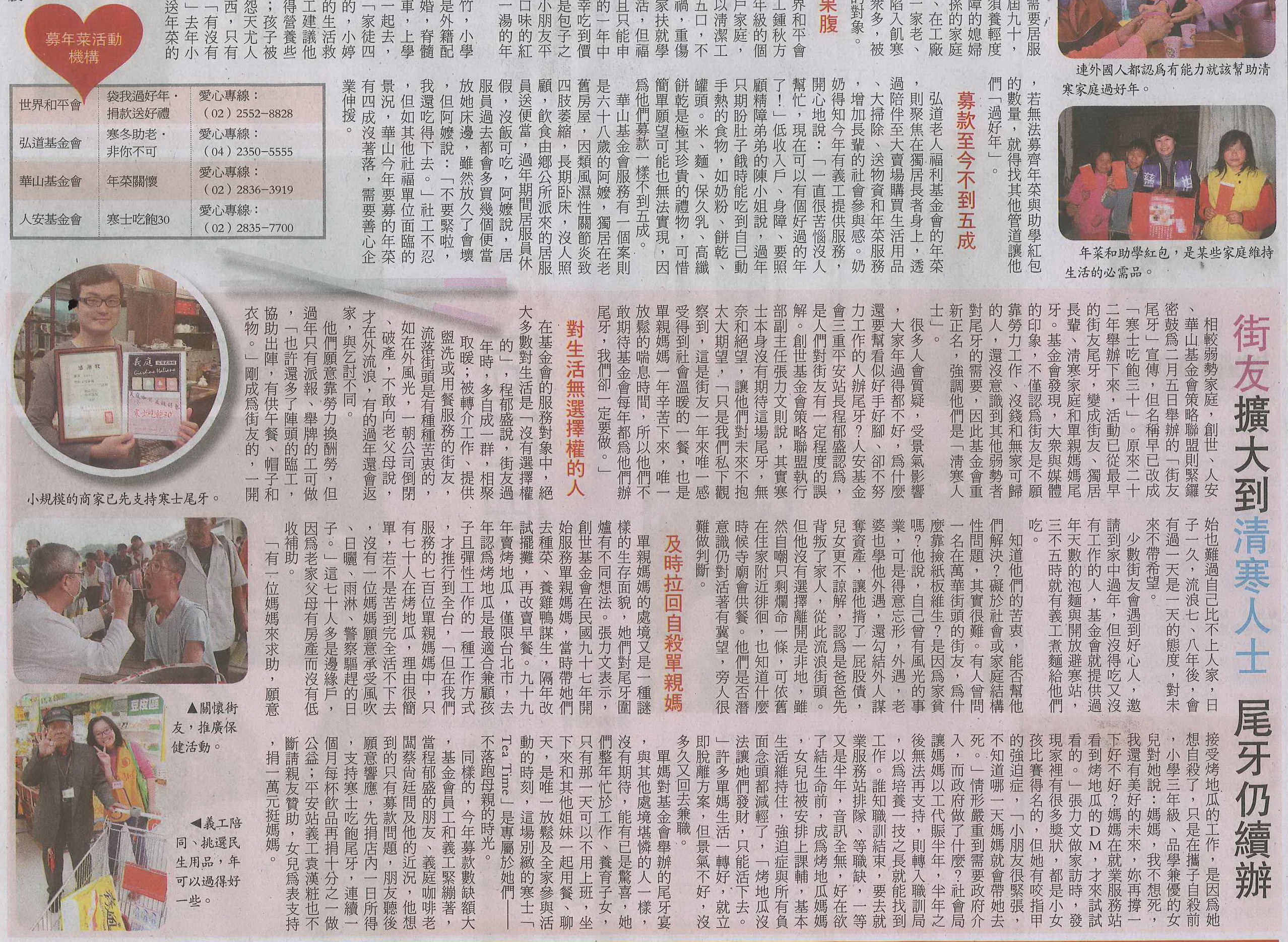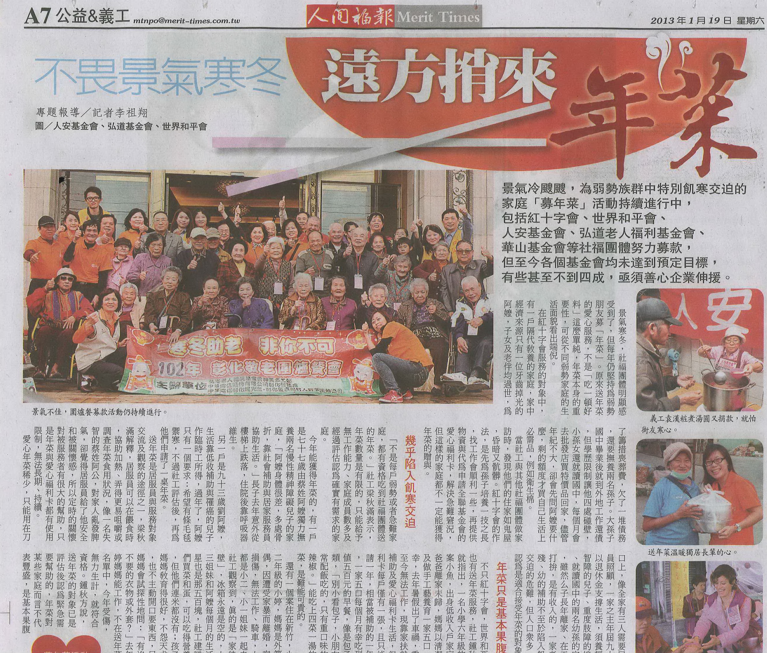 不只紅十字會,世界和平會也有送年菜服務,社工鍾秋方就指出,一名小學六年級的個案小魚,出身低收入戶家庭,爸爸離家未歸,媽媽以清潔工及做手工藝養育一家五口,不幸,去年暑假出了車禍,重傷至今無法工作,現靠家扶就學補助及愛心福利卡生活,但福利卡每戶僅有一張,且只能申請一年,相當被補助的一年中,一家五口每個月有幸吃到價值五百元的早餐,像是包子之類,「別小看包子,小朋友平常配飯吃的,只有重口味的紅辣椒。」能吃上四菜一湯的年菜,是難能可貴的。