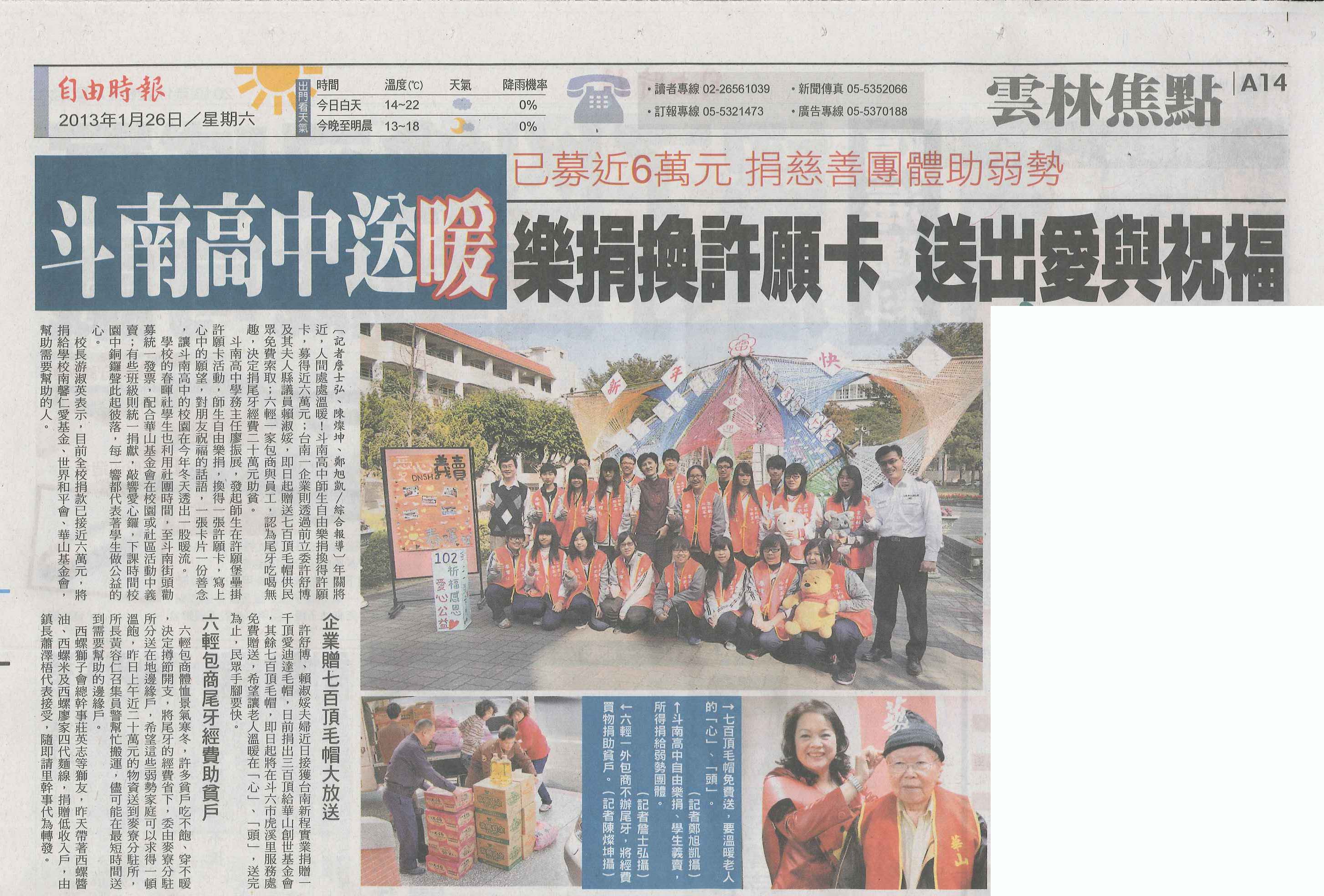年關將近,人間處處溫暖!斗南高中師生自由樂捐換得許願卡,募得近六萬元;台南一企業則透過前立委許舒博及其夫人縣議員賴淑娞,即日起贈送七百頂毛帽供民眾免費索取;六輕一家包商與員工,認為尾牙吃喝無趣,決定捐尾牙經費二十萬元助貧。