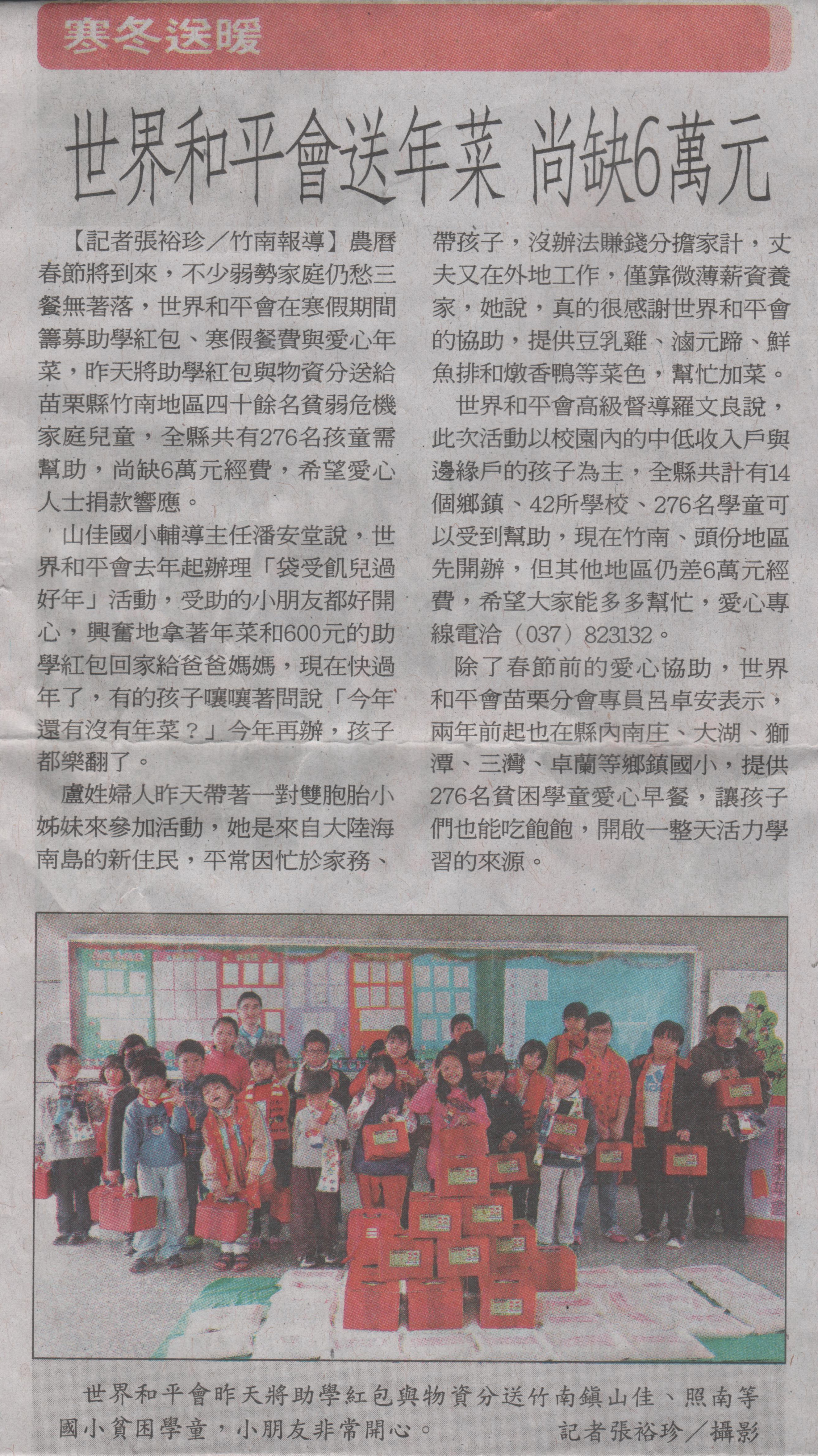 【聯合報】世界和平會送年菜 尚缺6萬元