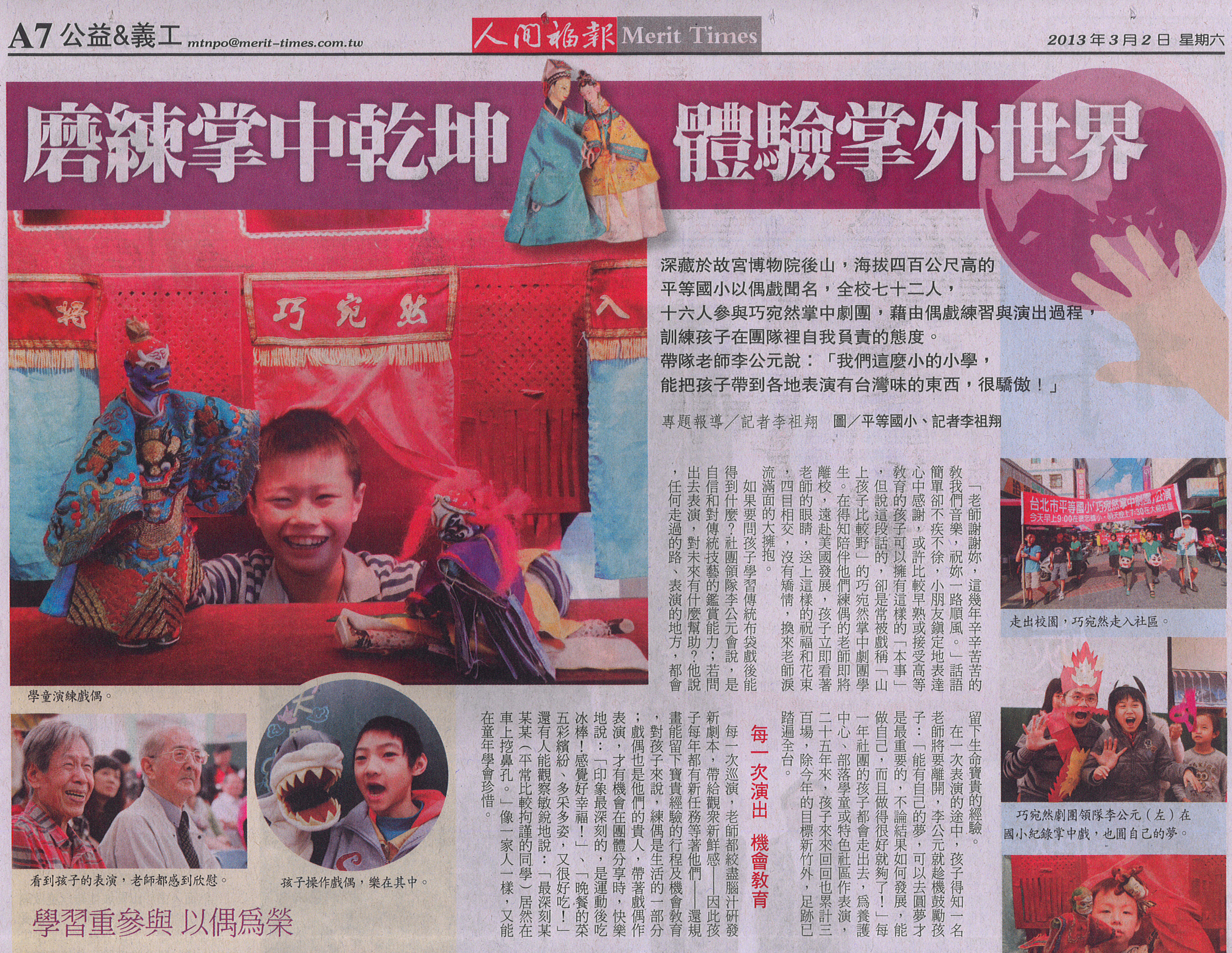 從故宮博物院上到後山小聚落,海拔四百公尺高的平等國小以偶戲聞名,全校七十二人,巧宛然掌中劇團就占十六人,但偶戲練習過程極度艱辛,不是所有的孩子都能受到傳統技藝的薰陶。此外,對平等國小而言,最缺乏的教育資源就是人際互動的刺激,所以老師突發奇想,舉辦一場別開生面的全校性偶戲大賽「以偶為榮」,讓所有老師、學生與家長對偶戲深入了解,建立偶戲共識。