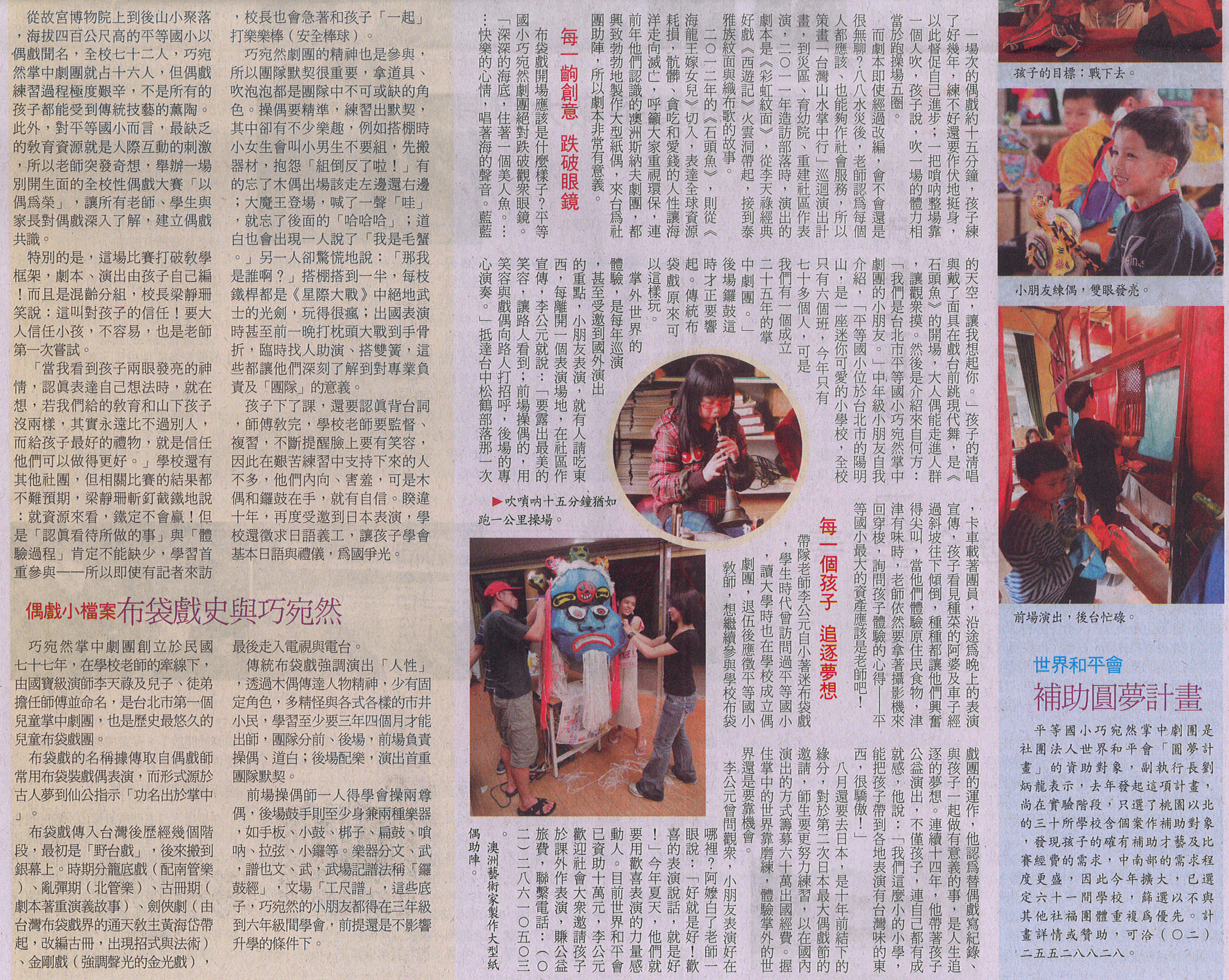 平等國小巧宛然掌中劇團是社團法人世界和平會「圓夢計畫」的資助對象,副執行長劉炳龍表示,去年發起這項計畫,尚在實驗階段,只選了桃園以北的三十所學校含個案作補助對象,發現孩子的確有補助才藝及比賽經費的需求,中南部的需求程度更盛,因此今年擴大,已選定六十一間學校,篩選以不與其他社福團體重複為優先。計畫詳情或贊助,可洽(○二)二五五二八八二八。