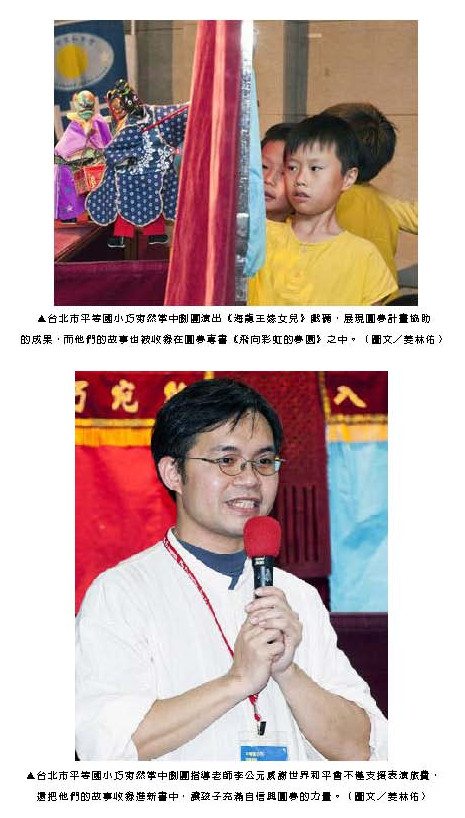 記者會上,接受圓夢計畫補助的台北市平等國小「巧宛然掌中劇團」,帶來精采的戲碼「海龍王嫁女兒」,十多名學童親自操偶、配樂,博得滿堂喝采,指導老師李公元表示,布袋戲社團所需經費龐大,尤其是聘請4名師傅指導的費用,一年高達30萬元,教育局補助費用頂多11萬元,其餘都需自籌,所幸去年有世界和平會5萬元補助支應,學童得以繼續學習布袋戲。平等國小六年級學生李宛霖擔任「鼓佬」職位,她說,雖然背打法很辛苦,但從中可以學到團隊合作,和大家一起演出,收穫多多。(記者許純鳳)