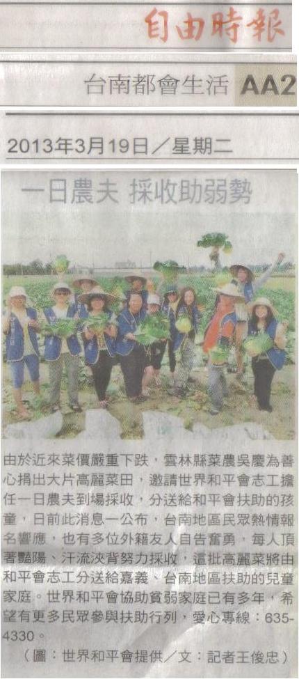 由於近來菜價嚴重下跌,雲林縣菜農吳慶為善心捐出大片高麗菜田,邀請世界和平會志工擔任一日農夫到場採收,分送給和平會扶助的孩童,日前此消息一公布,台南地區民眾熱情報名響應,也有多位外籍友人自告奮勇,每人頂著艷陽、汗流浹背努力採收,這批高麗菜將由和平會志工分送給嘉義、台南地區扶助的兒童家庭。世界和平會協助貧弱家庭已有多年,希望有更多民眾參與扶助行列,愛心專線:635-4330。(記者王俊忠)