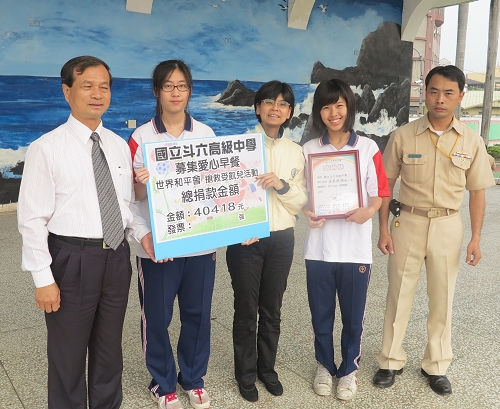 國立斗六高中全校師生,響應搶救受飢兒愛心撲滿,共募集4萬餘元,悉數捐贈社團法人世界和平會挹注貧困兒愛心早餐。校長劉永堂嘉勉學生繼續行善,亦希望社會響應此項愛心公益善舉。