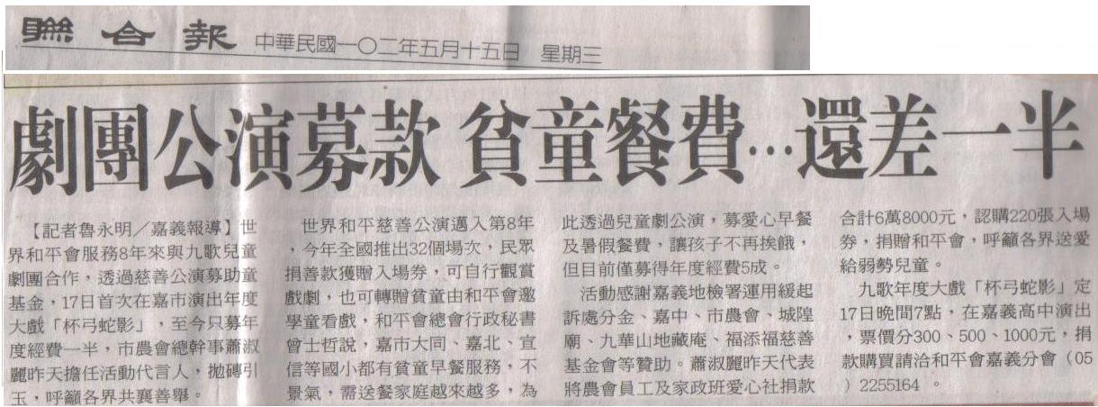 【聯合報】劇團公演募款 貧童餐費…還差一半