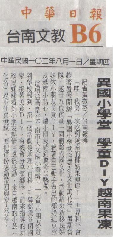 「哇!我第一次吃到越南的椰奶果凍耶!」世界和平會趁著暑假開辦「異國小學堂哈囉wow文化萬花筒」暑期營隊,邀請廿五位孩童一同體驗異國文化,活動請來新移民姐妹教小朋友美食DIY,看著自己動手做出的椰奶紅豆冰及越南小點心,讓小朋友感到驚奇又驕傲。