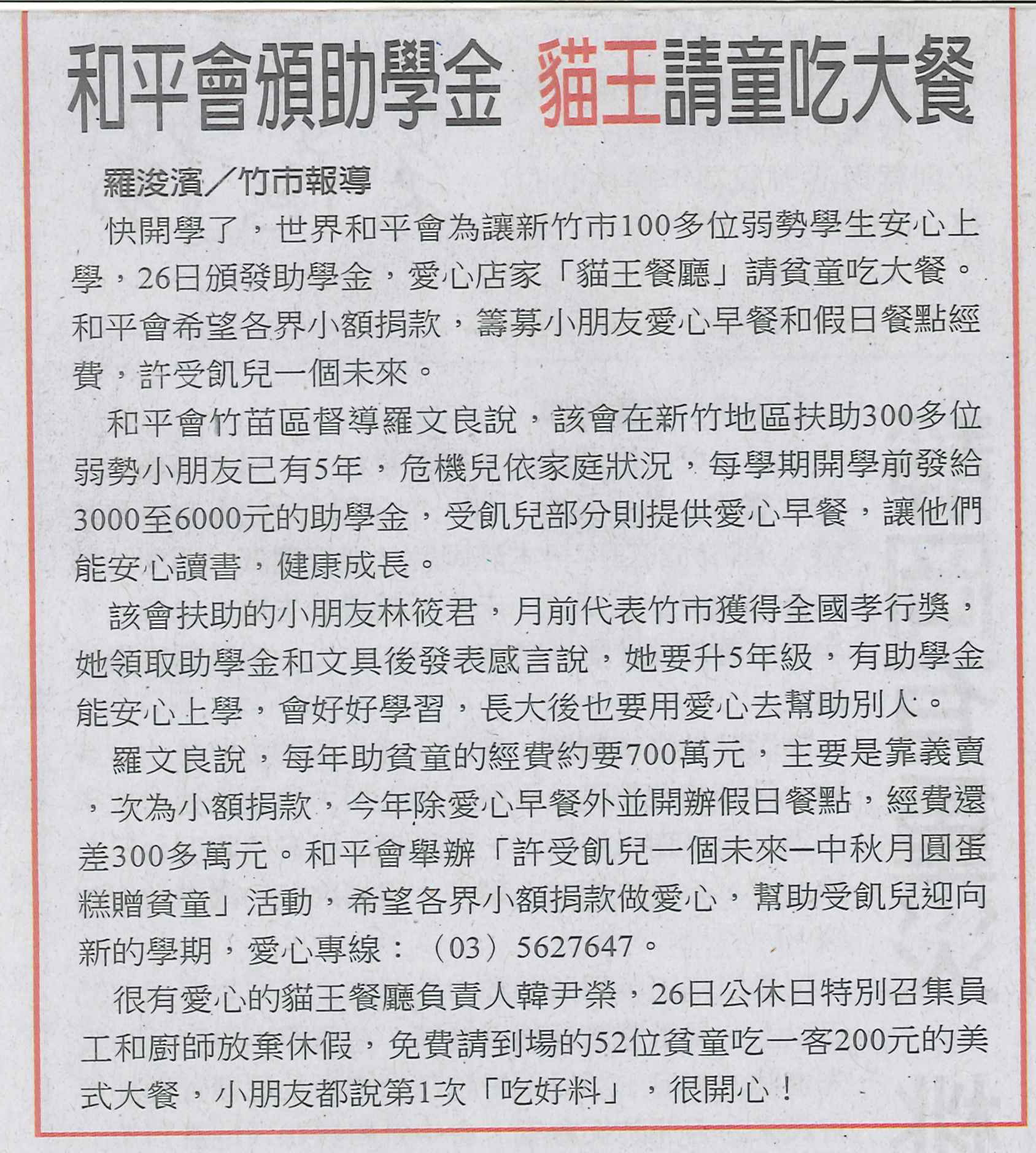 快開學了,世界和平會為讓新竹市100多位弱勢學生安心上學,26日頒發助學金,愛心店家「貓王餐廳」請貧童吃大餐。和平會希望各界小額捐款,籌募小朋友愛心早餐和假日餐點經費,許受飢兒一個未來。