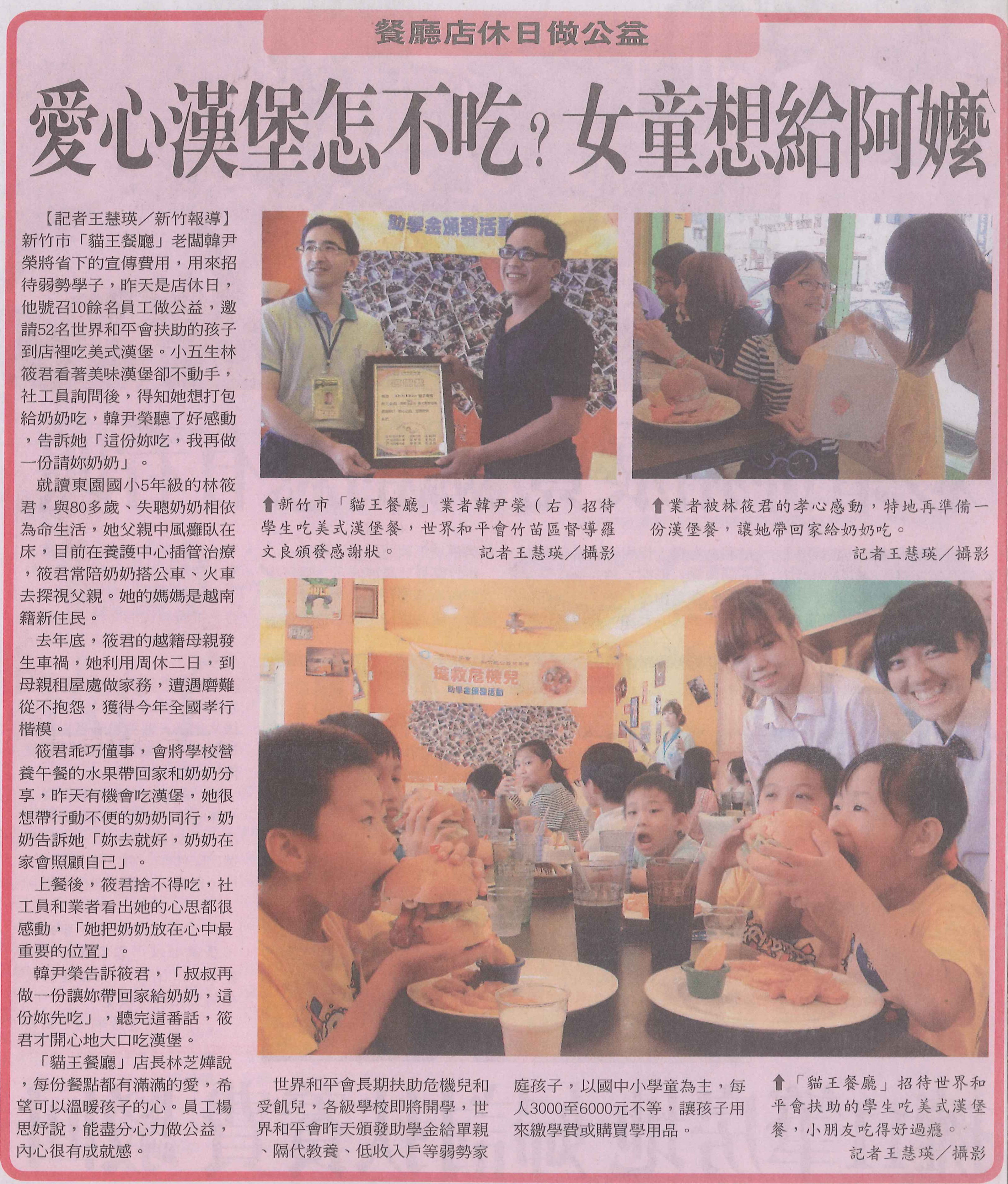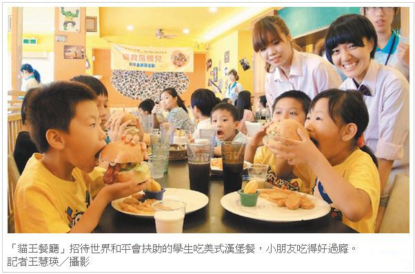 新竹市「貓王餐廳」老闆韓尹榮將省下的宣傳費用,用來招待弱勢學子,昨天是店休日,他號召10餘名員工做公益,邀請52名世界和平會扶助的孩子到店裡吃美式漢堡。小五生林筱君看著美味漢堡卻不動手,社工員詢問後,得知她想打包給奶奶吃,韓尹榮聽了好感動,告訴她「這份妳吃,我再做一份請妳奶奶」。