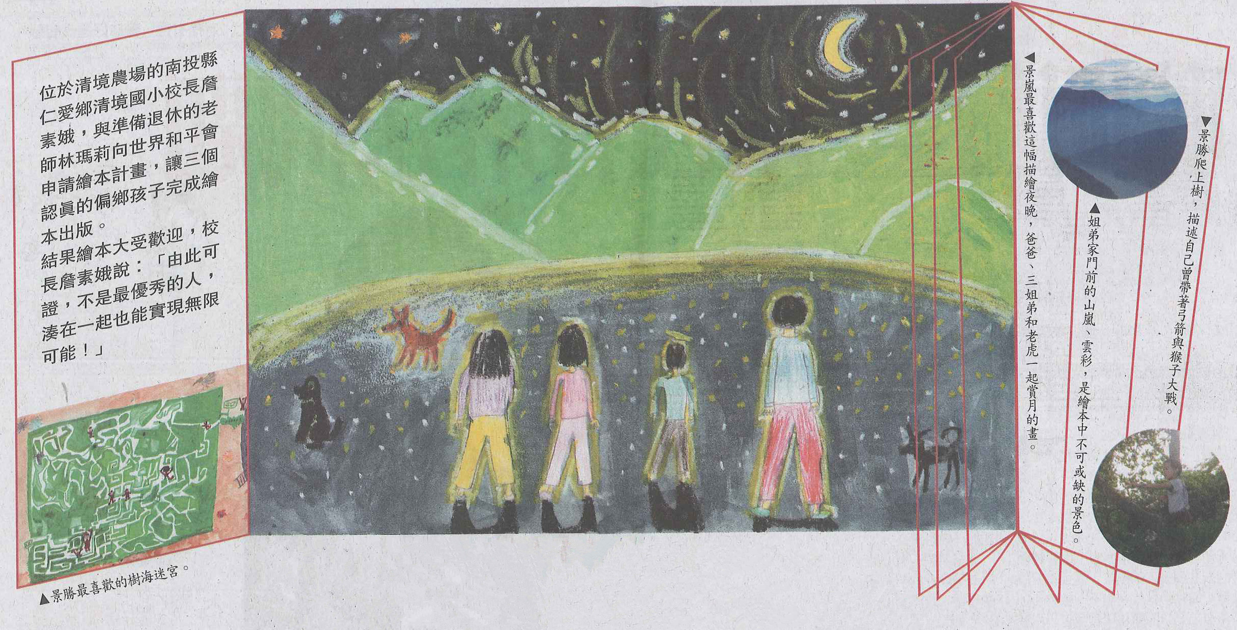 今年世界和平會擴大圓夢計畫,除了提撥補助金給偏遠學校社團使用,還針對經濟、資源較為缺乏的學童補助,完成小小心願。不過,位於清境農場的南投縣仁愛鄉清境國小校長詹素娥,與準備退休的老師林瑪莉去年底提出計畫申請,圓的卻是大人的夢──想讓三個孩子有充分的資源,完成沒有人看好、不認為能達成的事:出版繪本。