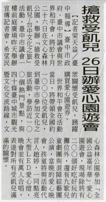 【真晨報】搶救受飢兒 26日辦愛心園遊會