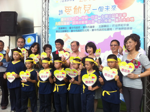 林議長表示,臺灣還有不少孩童無法吃飽,希望藉這個活動,讓所有想付出愛心的人,有機會付出愛心,許受飢兒一個美好的未來。文化局葉局長說,臺中除了是一個充滿愛的城市,更充滿了許多愛心與關懷。新聞局石局長認為,所有孩子都是我們的寶貝,感謝世界和平會的善心,希望大家一同來努力許孩子一個美好的未來。(記者吳守文)