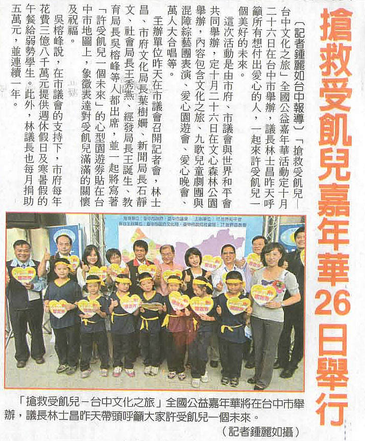 「搶救受飢兒-台中文化之旅」全國公益嘉年華活動定十月二十六日在台中市舉辦,議長林士昌昨天呼籲所有想付出愛心的人,一起來許受飢兒一個美好的未來。