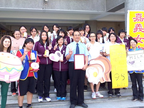 高中生也是很有愛心的,嘉女輔導室何老師請到現場的嘉女同學們,一一拿著自己班級的愛心牛奶撲滿,與校長在校門口前,跟著世界和平會的工作人員一起合影,為這次長達1個月的「嘉女『愛』很大」活動,巷作一個美好的結束。