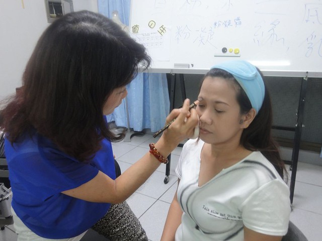 新移民姐妹們兩兩一組,互為彼此的模特兒,從卸妝、洗臉到上妝等…,新移民姐妹聽從老師的指示,每個步驟細心完成,遇到不懂的地方也會請老師再示範一 次,直到學會為止。每當新移民姐妹們為自己的模特兒上妝完畢之後,彼此會用母語溝通,互相讚美、鼓勵對方。同時,也會邀請老師為自己的作品評分,並給予建 議,希望每一次的上課,自已能再進步一些,對於美容技巧也能再更加熟悉。