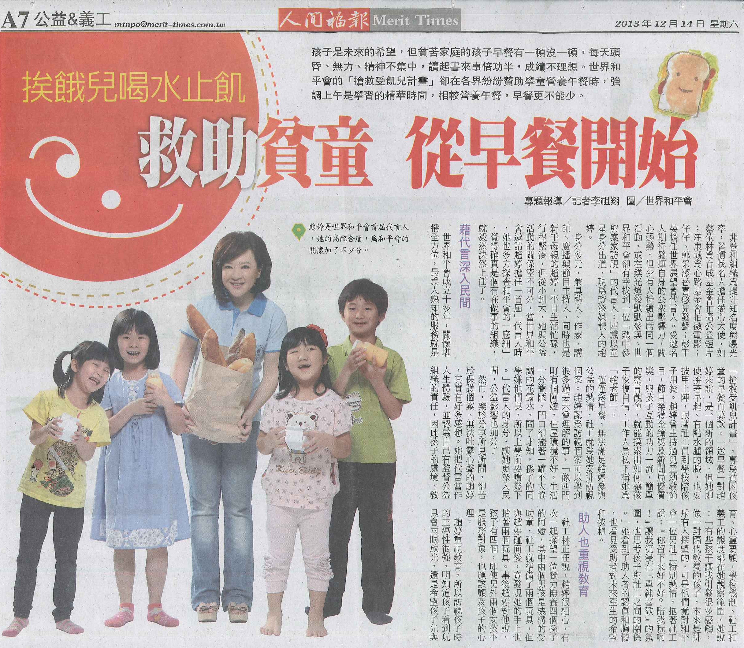 世界和平會成立十多年,關懷堪 稱全方位,最為人熟知的服務就是「搶救受飢兒計畫」,專為貧困孩童的早餐而募款。「送早餐」對趙婷來說,是一個新的領域,但她即使拚著早起、有點水腫的臉,也要披甲上陣,跟著社工員到學校陪孩子用餐。趙婷曾主持過兒童幼教節目,節目榮獲金鐘獎及新聞局優質獎,與孩子互動的功力一流,簡單的察言觀色,就能摸索出如何讓孩子恢復自信,工作人員私下稱她為「趙老師」。