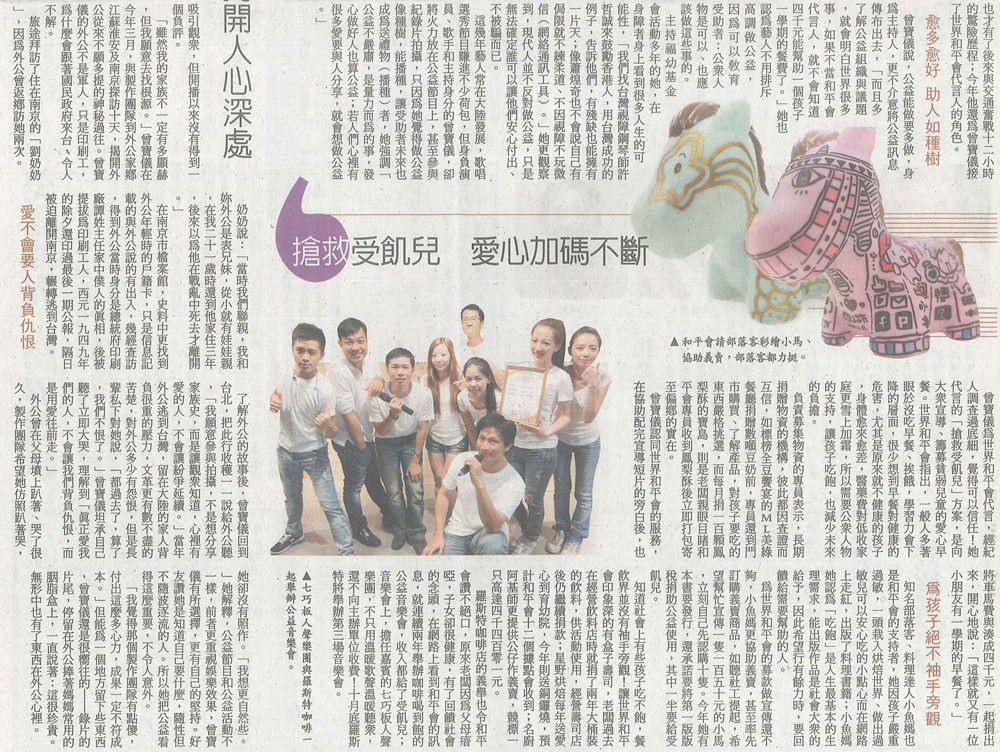 為世界和平會的募款做宣傳還不夠,小魚媽更協助義賣,甚至率先訂購義賣商品,如聽社工提起,希望幫忙宣傳一隻一百五十元的小馬,立刻自己先認購十隻。今年她有本書要發行,還承諾要將第一版版稅捐助公益使用,其中一半要給受飢兒。