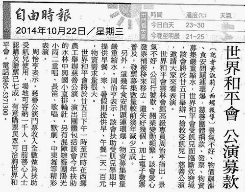 【自由時報】世界和平會 25日西螺公演募款