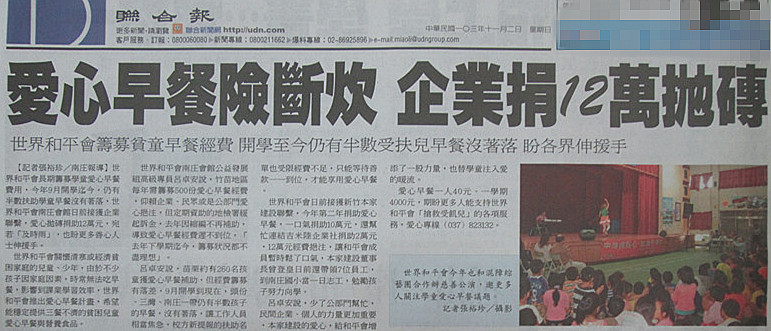 【聯合報】愛心早餐險斷炊 企業捐12萬拋磚